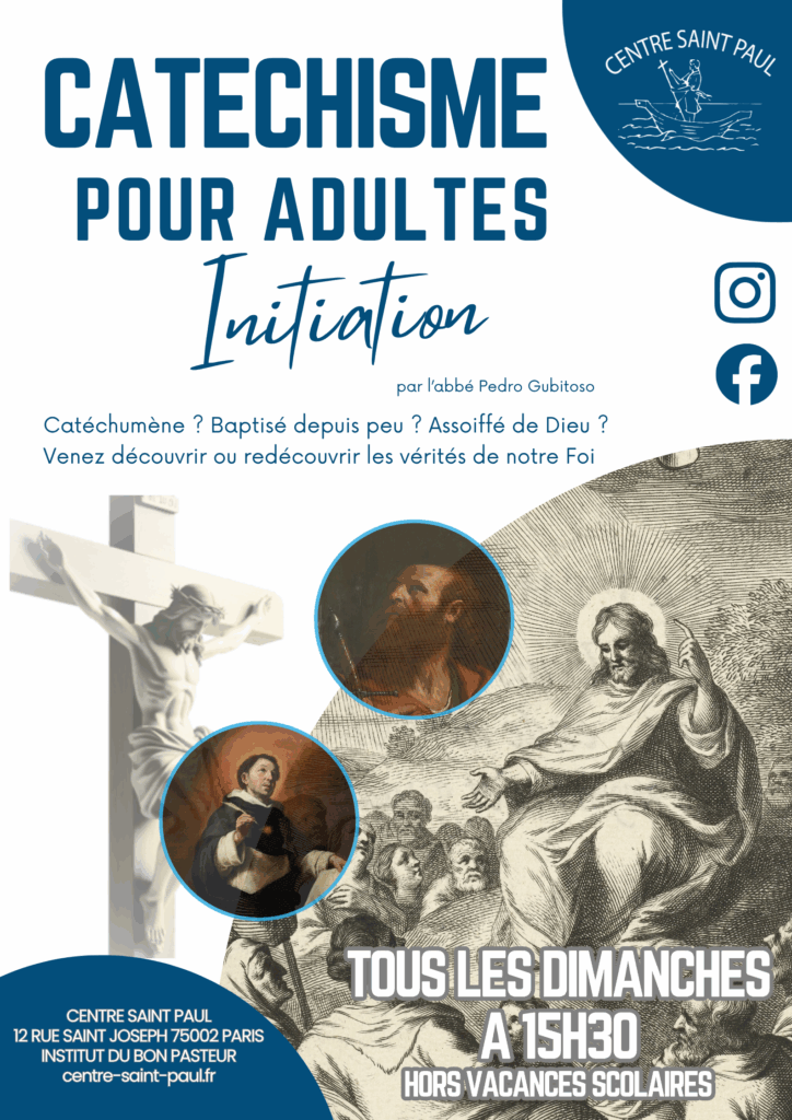 Chaque vendredi en dehors des vacances scolaires et des premiers vendredis du mois, l’abbé Billot offre un cours de spiritualité à l’école des saints. Après le chapelet (18h30) et la Messe (19h), le cours commence à 20h et est suivi d’un temps de prière / application pratique vers 21h.